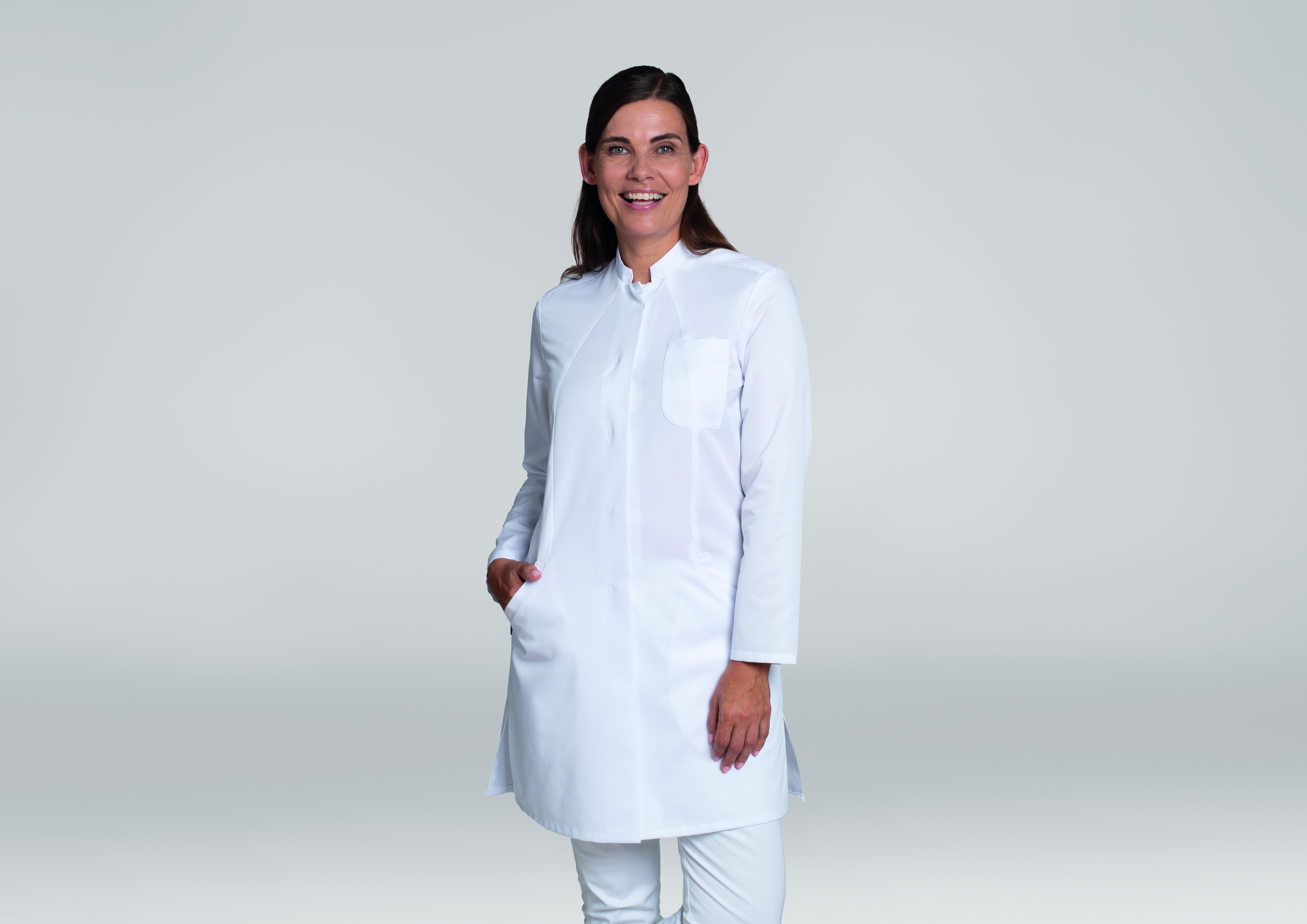 Ca. 200 g/m², 95° waschbar, Clean Dress, ISO 15797 / PRO-Label Industriewäsche geeignet, Leiber Damen Kasack weiß mit verdeckten Druckknöpfe, Stehkragen und praktische Seitenschlitze, 2 aufgesetzte, abgerundete Seitentaschen, 1 Brusttasche, Teilungsnähte im Vorder-/Rückenteil, Rückenlänge bei Gr. 38 ca. 90 cm, Gr. 34-54