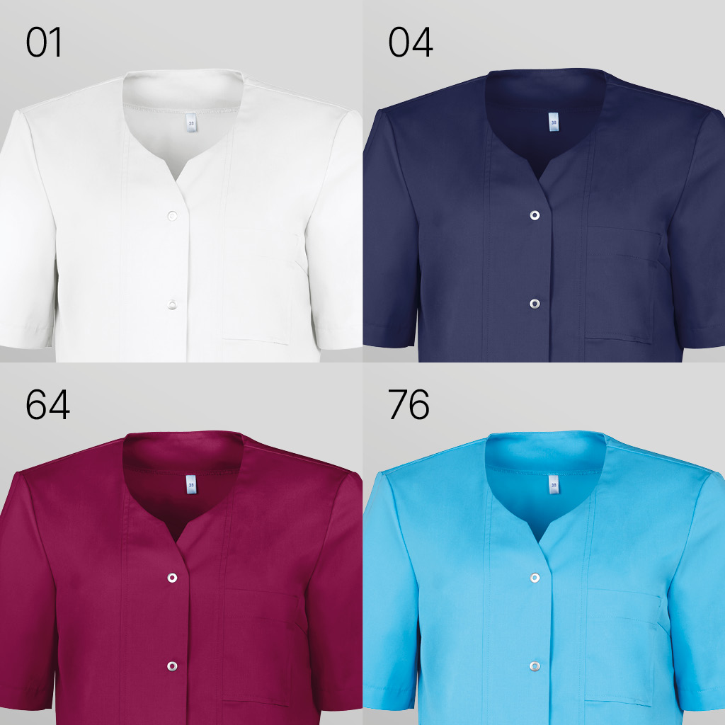 Ca. 180 g/m². 60° waschbar, ISO 15797 / PRO-Label Industriewäsche geeignet, Gewebe aus recyceltem Polyester, Druckknopfverschluss, raffinierter V-Ausschnitt, 2 Seitentaschen, 1 Brusttasche, Seitenschlitze, Leiber Kasack Damen, Rückenlänge bei Gr. S ca. 75 cm, Gr. XS-3XL