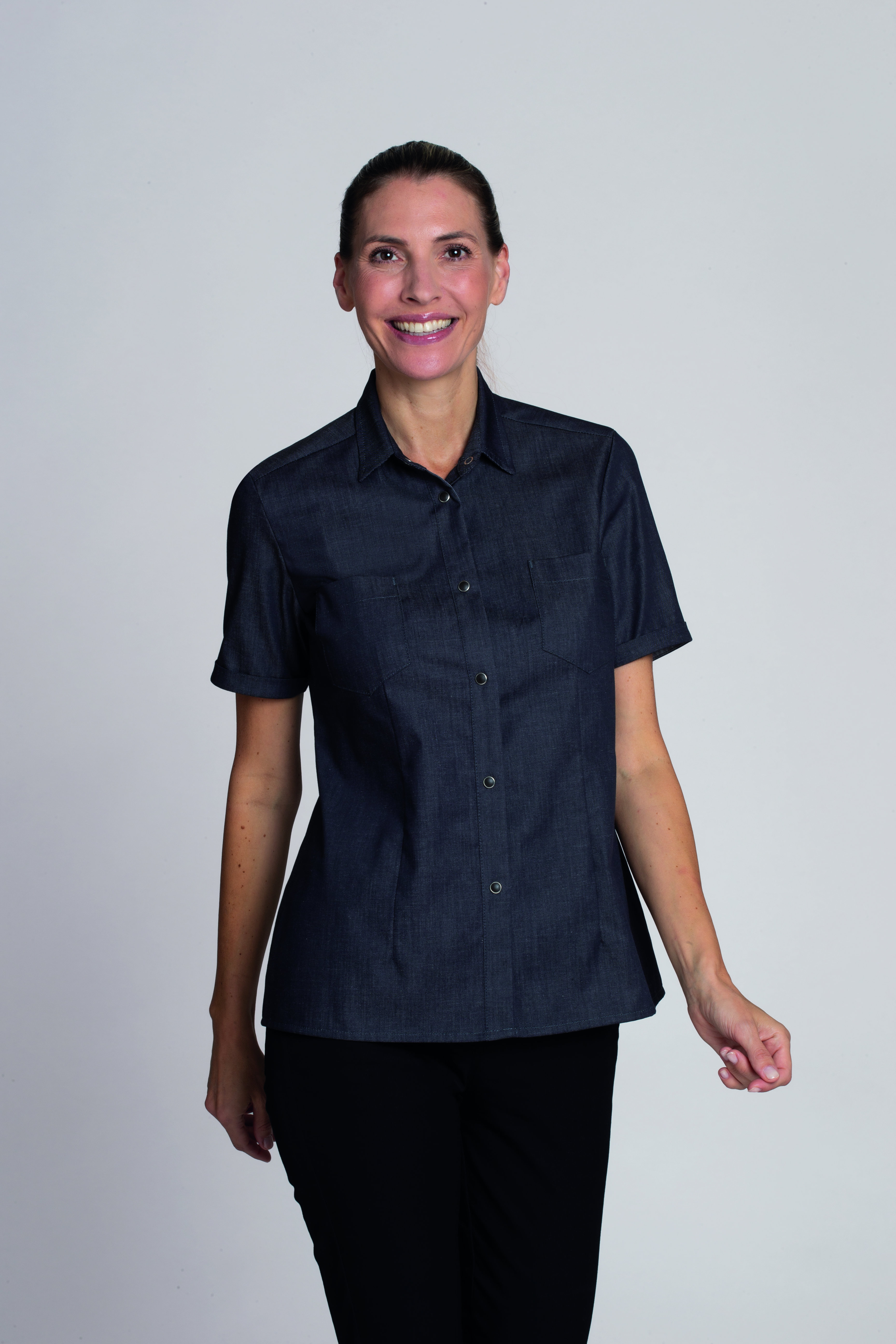 Ca. 125 g/m², 60° waschbar, chlorecht, Leiber Bluse in jeansgrau, taillierte Form mit Teilungsnähten im Vorder-/Rückenteil, attraktive Druckknöpfe, 2 aufgesetzte Brusttaschen, angenehm leichtes, strapazierfähiges Gewebe, Industriewäsche geeignet, Rückenlänge bei Gr. 38 ca. 66 cm, Gr. XS-2XL
