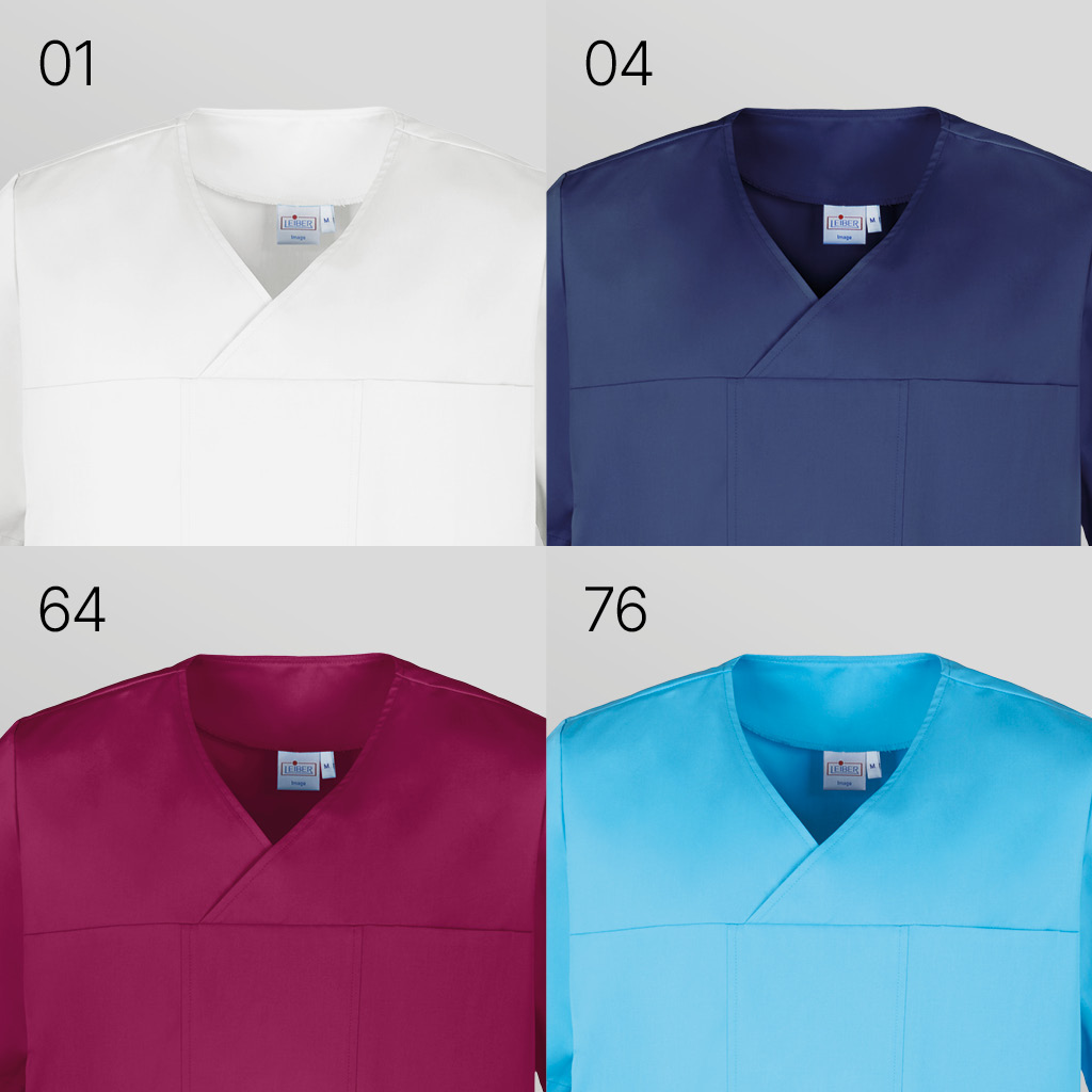 Ca. 180 g/m², 60° waschbar, ISO 15797 / PRO-Label 8 Industriewäsche geeignet, Leiber Schlupfkasack kurzarm in marineblau, beere, türkis, Gewebe aus recyceltem Polyester, überlappender V-Ausschnitt, 2 Seitentaschen, 1 eingelassene Brusttasche, Seitenschlitze, Rückenlänge Gr. M = ca. 76 cm, BITTE WÄHLEN SIE DIE FARBE AUS, Gr. XS-3XL