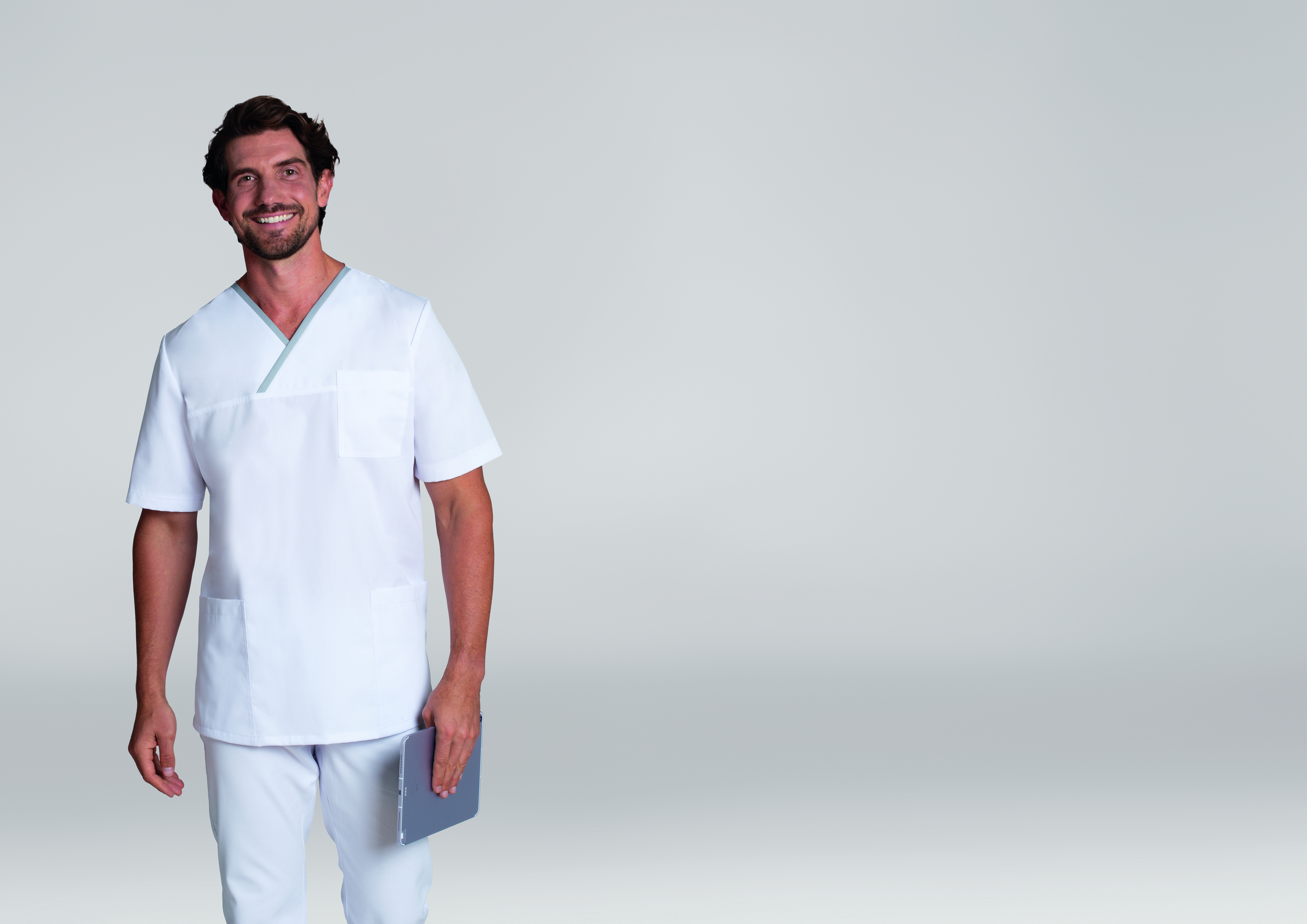 Ca. 150 g/m², 95° waschbar, Leiber Schlupfkasack kurzarm für Damen und Herren silbergrau/weiß, anthrazit/silbergrau, beere/weiß oder türkis/weiß, überlappender V-Ausschnitt mit farbiger Paspelierung, atmungsaktives Stretchgewebe aus Piqué-Gewebe aus TENCEL™ Lyocell am hinteren Schulterbereich, 2 aufgesetzte Seitentaschen, 1 Brusttasche, Seitenschlitze, Rückenlänge bei Gr. M ca. 77 cm, bitte wählen Sie die Farbe aus, Gr. XS-3XL