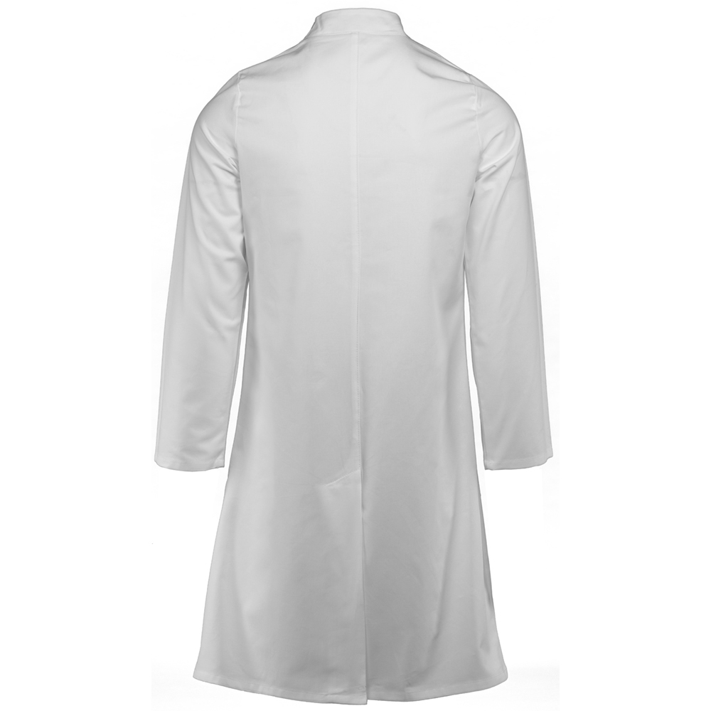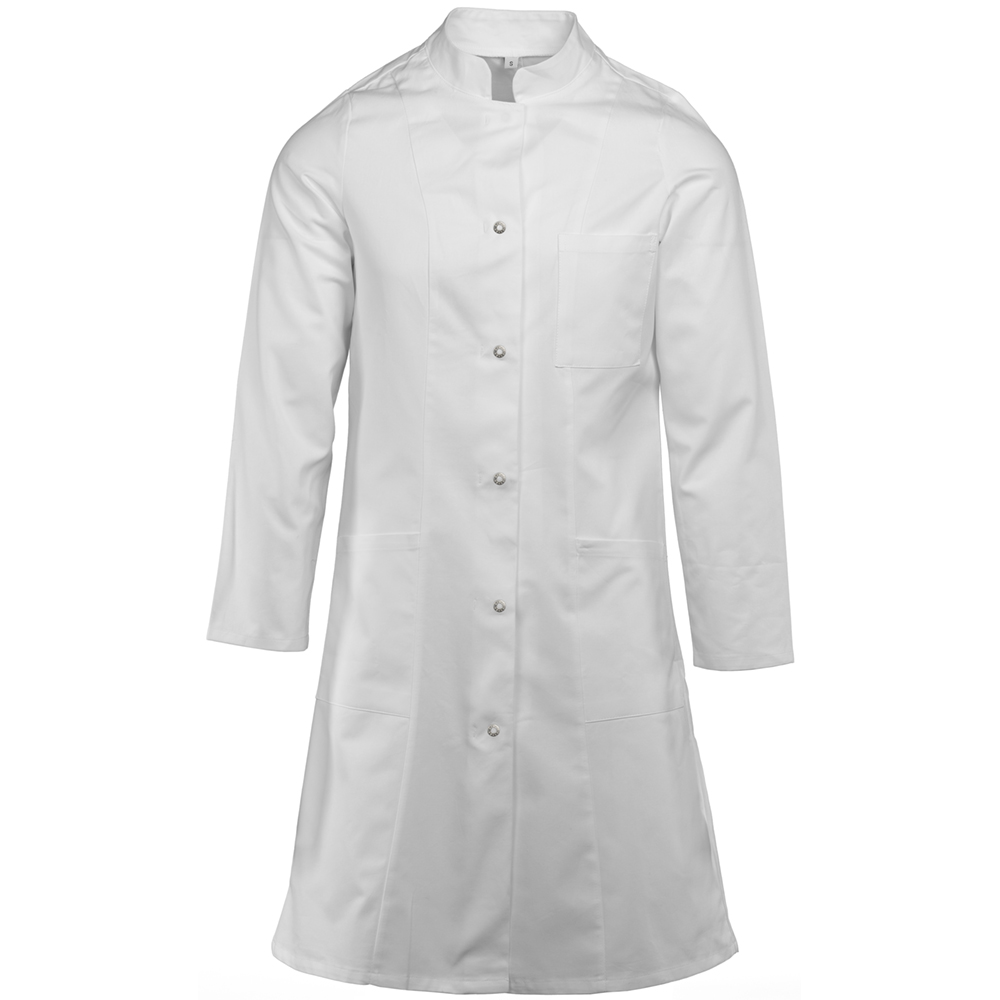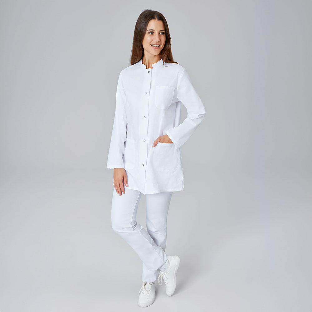 Ca. 175 g/m², 90° waschbar, Industriewäsche geeignet, autoklavierbar, sterilisierbar, Damen Kurzmantel langarm mit Stehkragen, verdeckte Druckknopfleiste, 1 Brusttasche ca. Breite x Höhe 12x13 cm, 2 aufgesetzte Taschen, Seitenschlitz ca. 10cm, Rückenlänge Gr. S ca. 80 cm, Gr. XS-5XL