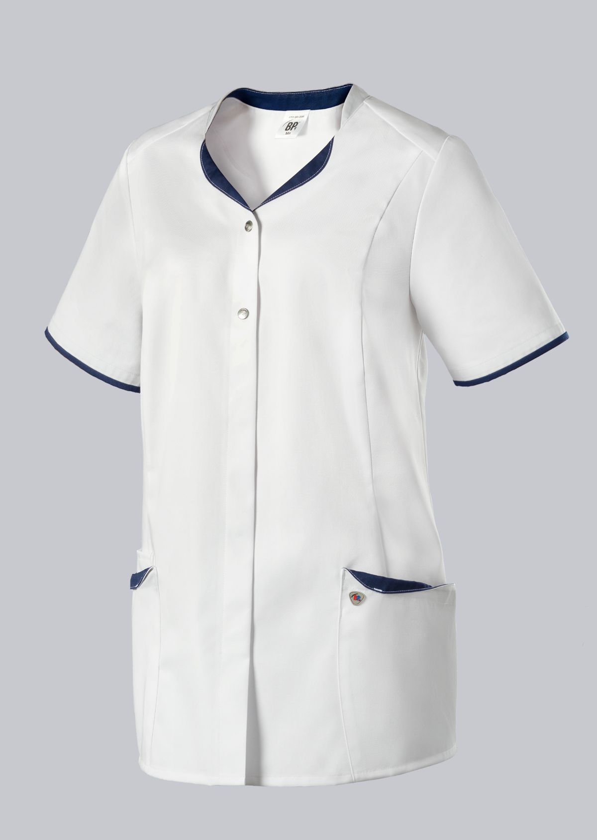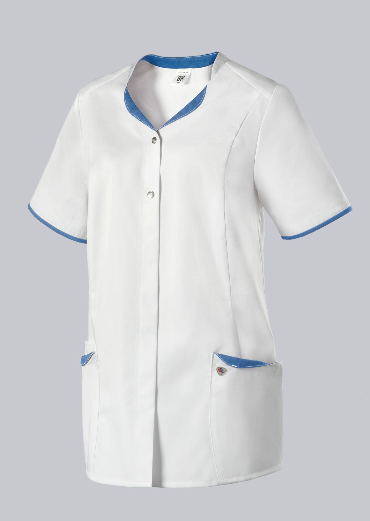 Ca. 215 g/m², 95° waschbar, Oekotex 100, Prolabel 6 Industriewäsche-geeignet nach ISO 15797, Damen Kasack mit modernen V-Ausschnitt, Stehkragen, verdeckte Druckknopfleiste mit 2 sichtbaren Druckknöpfen, geräumige Taschen und Schlüsselschlaufe, hoher Baumwollanteil (Supporting Fairtrade Cotton), Modern Fit, 1/2-Arm, 2 geräumige Seitentaschen, davon 1 mit Schlüsselschlaufe und 1 mit Smartphonetasche, in den Farben weiß/azurblau, weiß nachtblau und weiß/koralle erhältlich, BITTE WÄHLEN SIE DIE FARBE AUS, Gr. XS-3XL