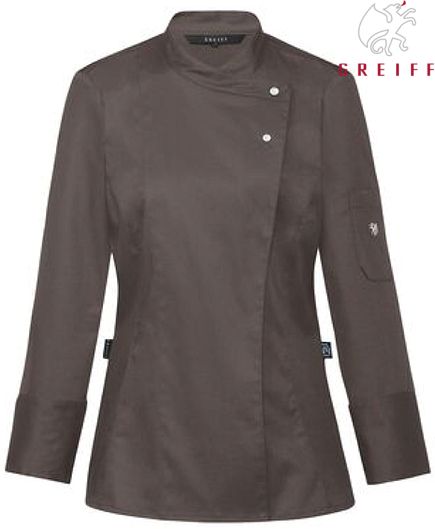 Ca. 200 g/m², 95° waschbar, Regular fit, elastisch, Greiff Damen Kochjacke mit Jersey-Rücken, verdeckte Druckknöpfe, 2 sichtbare Druckknöpfe in Permutt-Optik, Armtasche mit Logo, Lüftungslöcher, Wiener Nähte im Vorder- und Rückenteil, Gr. XS-4XL