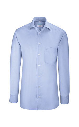 Ca. 125 g/m², 60° waschbar, Tunnelfinisher geeignet, Non Iron, Regular Fit, Greiff Hemd bleu mit New-Kent-Kragen, 1 Brusttasche, weitenverstellbare Manschette, Knopf am Armschlitz, 2 Rückenfalten, Gr. 35/36-47/48