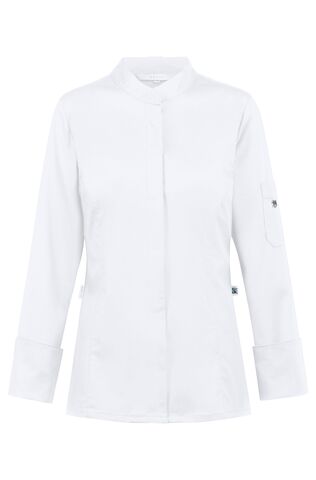 Die leicht tailliert geschnittene Kochjacke sieht gut aus und macht viel mit – perfekt für den Küchenalltag. Lüftungslöcher sorgen für zusätzlichen Tragekomfort und in der Armtasche ist Platz für kleinere Küchenutensilien, die schnell zur Hand sein sollen. Die verdeckte Druckknopfleiste ist praktisch und unterstreicht den klaren, femininen Look.